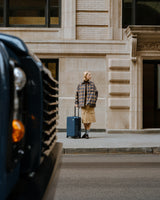 Mit seiner glänzenden Außenseite in Arles Blue – einem Farbton aus der Land Rover Palette der 1990er Jahre – spiegelt unser Gepäck die markante Farbgebung des Defender 90 wider und verkörpert seine zeitlose Präsenz und den Entdeckergeist.
