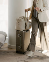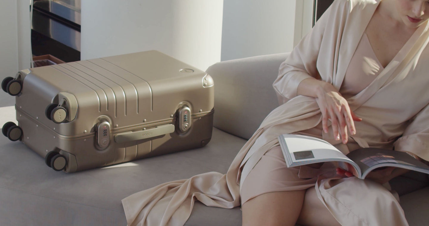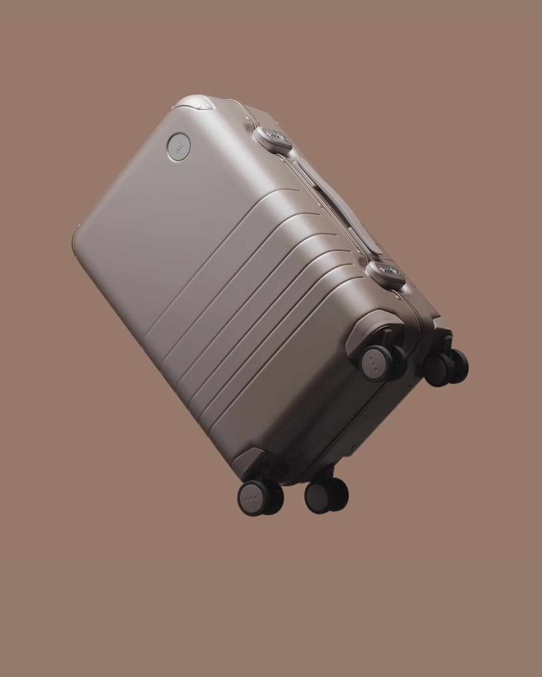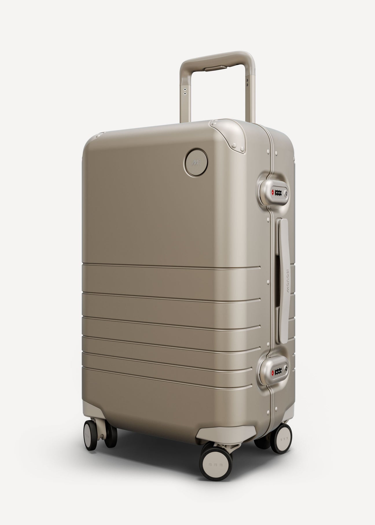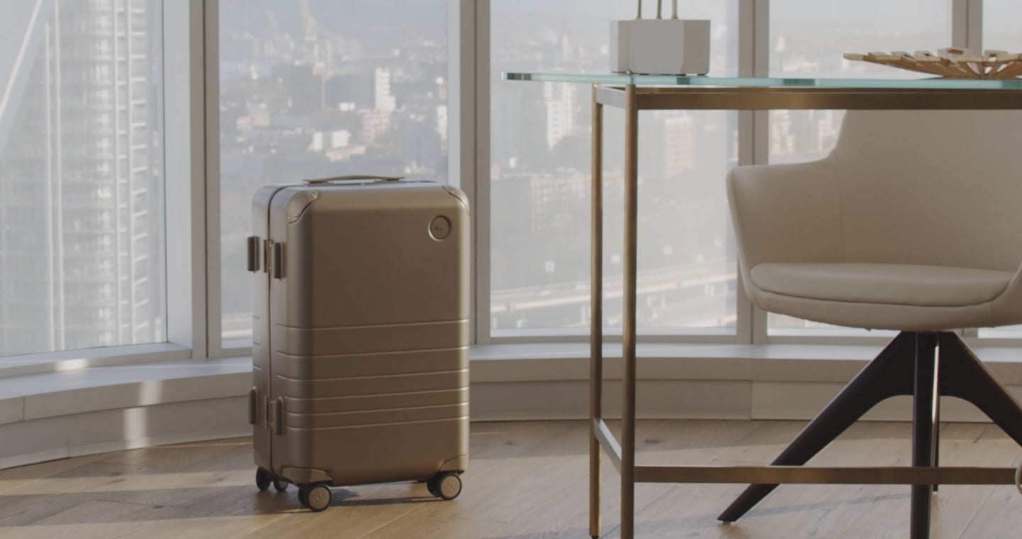 We chose to reinforce the most critical areas with aluminum, and use our aerospace-grade polycarbonate for the shell – all in a refined metallic finish. The result is the best of two worlds: the resilience and sophistication of an aluminum suitcase, combined with the light weight and durability of a polycarbonate case.